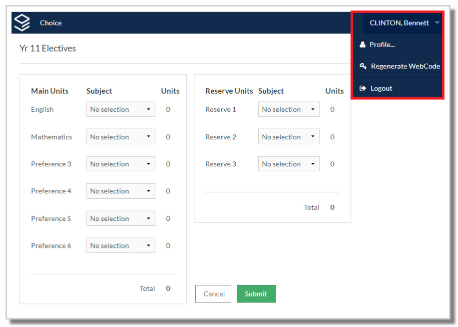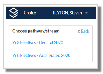 Students can access their profile at the top right of the Choice screen.