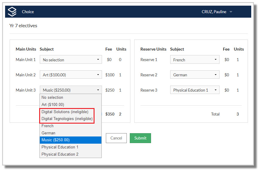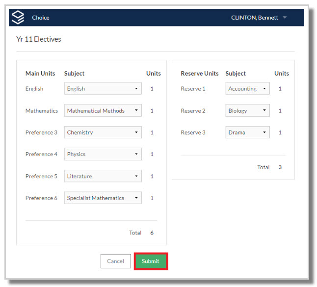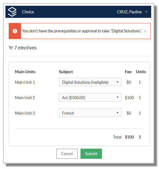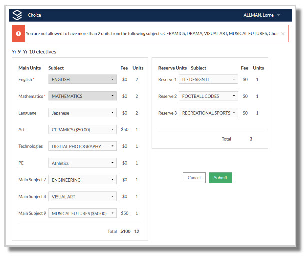 Once students have entered all their subject preferences and selected the Submit button, the system will check that they have met any rules set up by the school. If they have, their submission will be accepted.