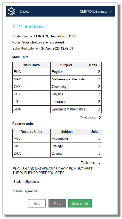 Students can print a hard copy of their submitted subject preference form.