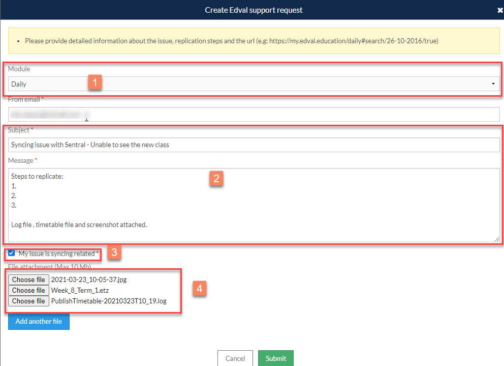 - Upload: Upload the log file, screenshots and any other necessary files to investigate. Your timetable file is automatically attached.