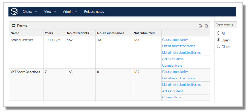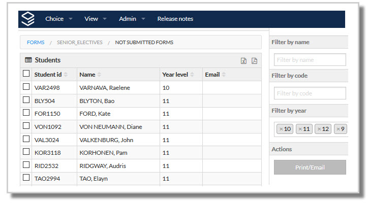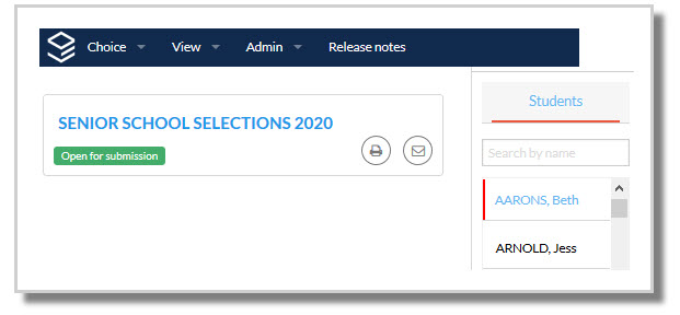 Administrators and approved users may submit choices on behalf of a student via the Act as student link. The user can select a student from the right, and will be taken to the relevant forms the student would see if they were to log in using their individual WebCode. The code of the administrator or approved user will be logged against the submission.