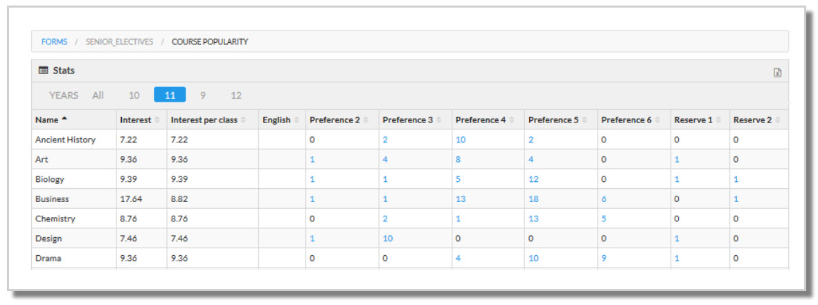 The Course popularity report displays the number of students who have selected a course at each preference level. It is used to assist in the planning which courses to run, and how many classes of each.