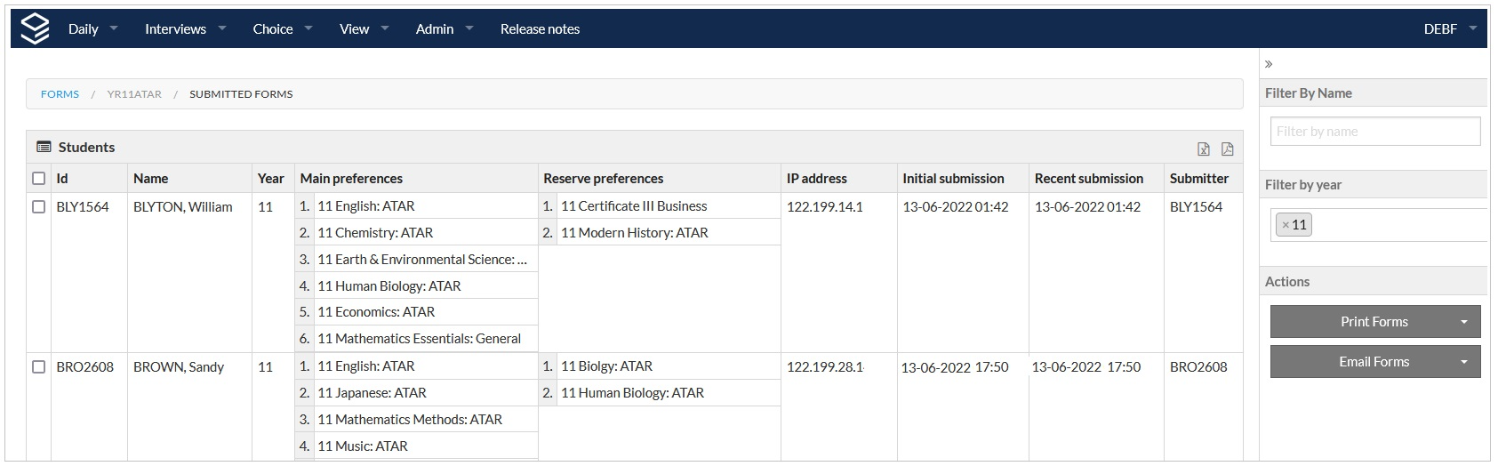 Students who have submitted preferences will display, along with submission details.