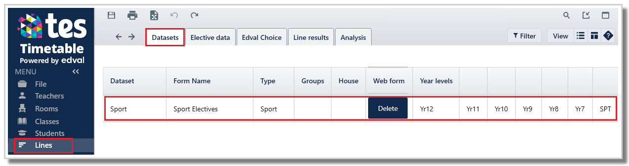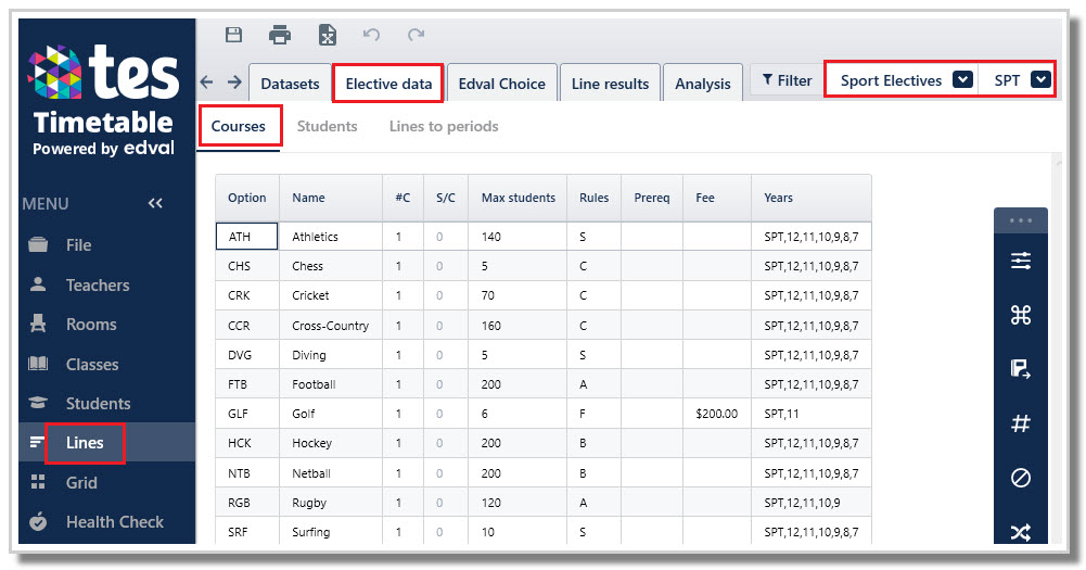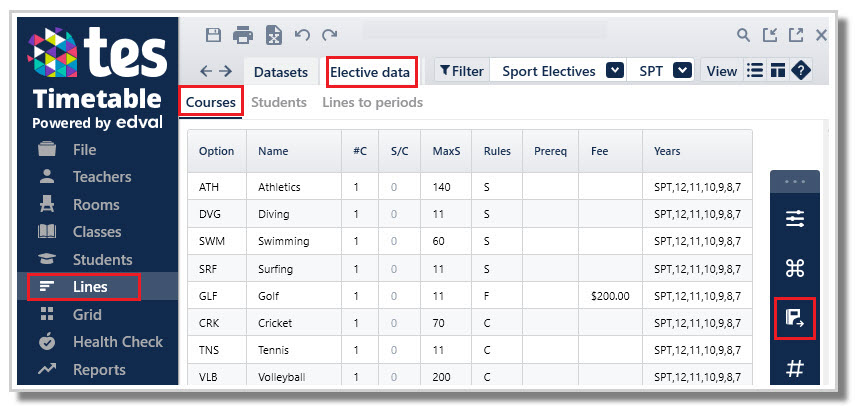 Navigate to Lines > Elective data > Courses. Filter, in the top menu on the right, by the sport dataset, e.g. Sport Electives, and select the SPT year level.