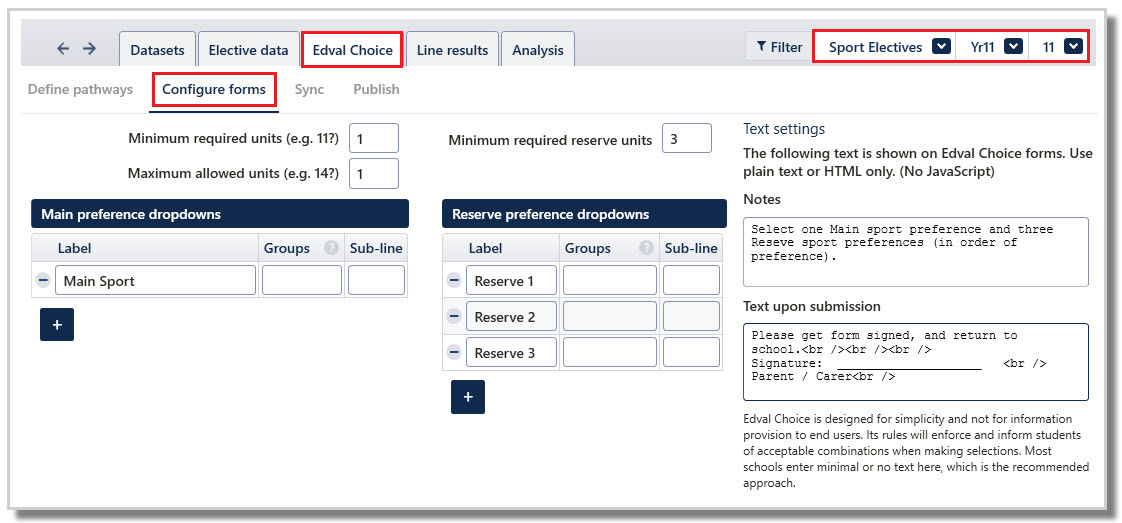 Navigate to Lines > Edval Choice > Configure forms. Filter by the sport dataset e.g. Sport Electives and select the required year level. Each year level that will select sport requires its own configured form.