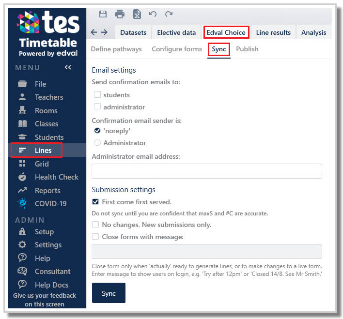 Navigate to Lines > Edval Choice > Sync. Enter the desired settings.