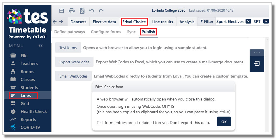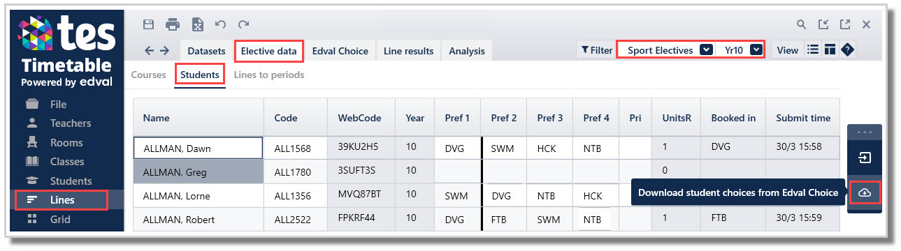 Once the submission period ends, the forms can be closed in Lines > Edval Choice > Sync. Navigate to  Lines > Elective data > Students.  From the top menu on the right, select the Sport dataset. In the action bar on the right hand side of the Students' screen, select the 'Download student choices from Edval Choice' icon to download the students' sport electives.