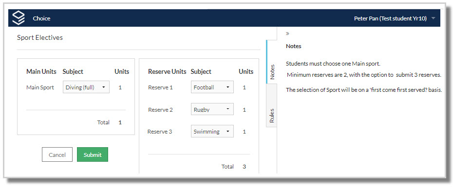 A Sport type dataset is simplified compared to the Electives type dataset. It is easily set up and its purpose is for sport data collection and class creation only. No line generation occurs. The students log into Choice with their WebCodes and select one sport preference for the rotation / term / semester. Students should choose some reserve sport options in case they can't be placed into their preferred sport. They may repeat the selection process for the next rotation / term / semester. Once student sport choices have been downloaded, the result can be viewed and managed in Lines > Elective data > Courses. The sport classes are then created without any teacher / room considerations.