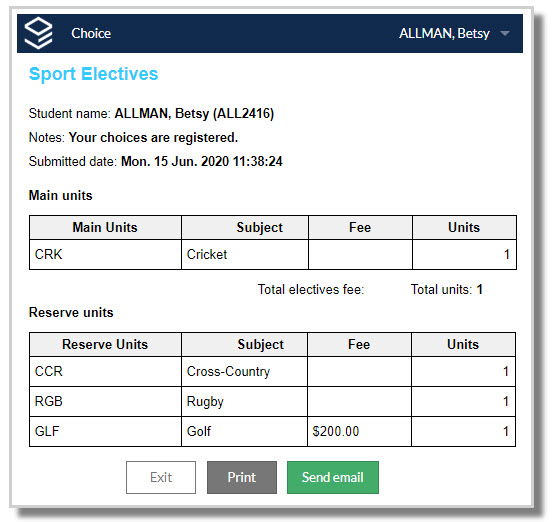Students log in to my.edval.education with their WebCodes to select their sport choices and submit the form. They may email or print a copy of their submission.