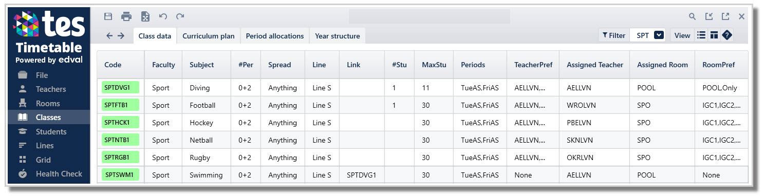 TeacherPrefThe sport classes are created without any teacher considerations. Select teacher preferences via Teachers > Subject teachers for each sport option. Assign teachers as required in Teachers > Staff allocations (F4).
