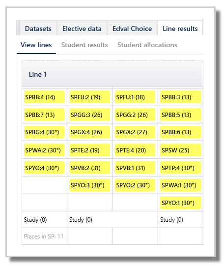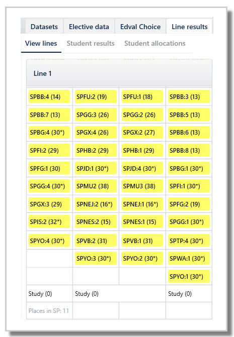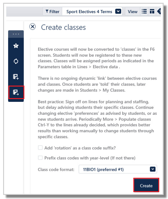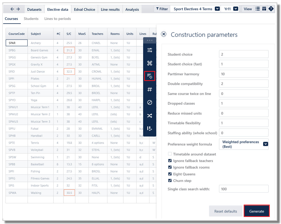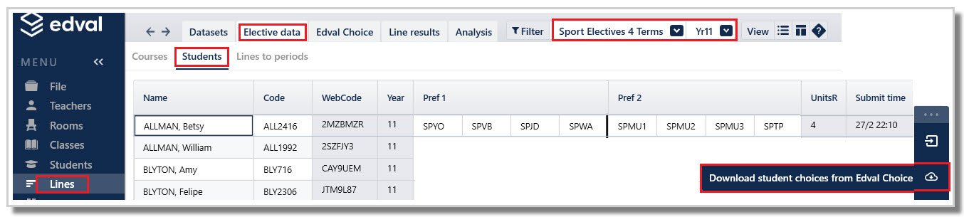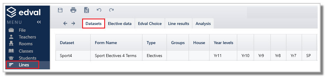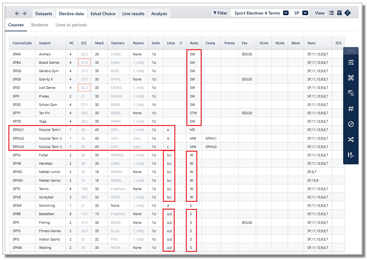 - Navigate to Lines > Elective data > Courses > Filter: Sport electives 4 Terms dataset.