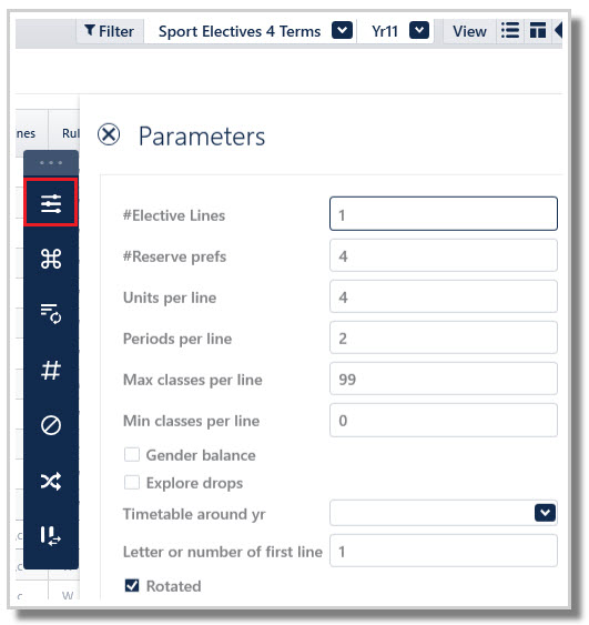 - In the Lines > Elective data > Courses screen, click on the Parameters icon in the action bar on the right hand side of the screen for the Parameters table to slide out.