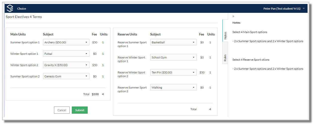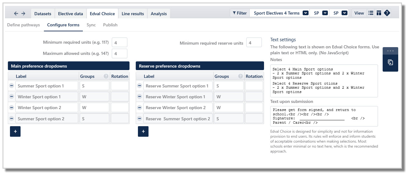 Rules | Sport options can be categorised by allocating a letter of the alphabet in the Rules column, e.g. W for Winter and S for Summer sport options. Submission rules can then be added such as 'at least' - 2 units - Summer sport options and 'at least' - 2 units - Winter sport options to ensure that students have the correct combination of sports. |