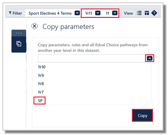 - Filter, in the top menu on the right, by the dataset, e.g. Sport Electives 4 Terms, and select the SP year level.