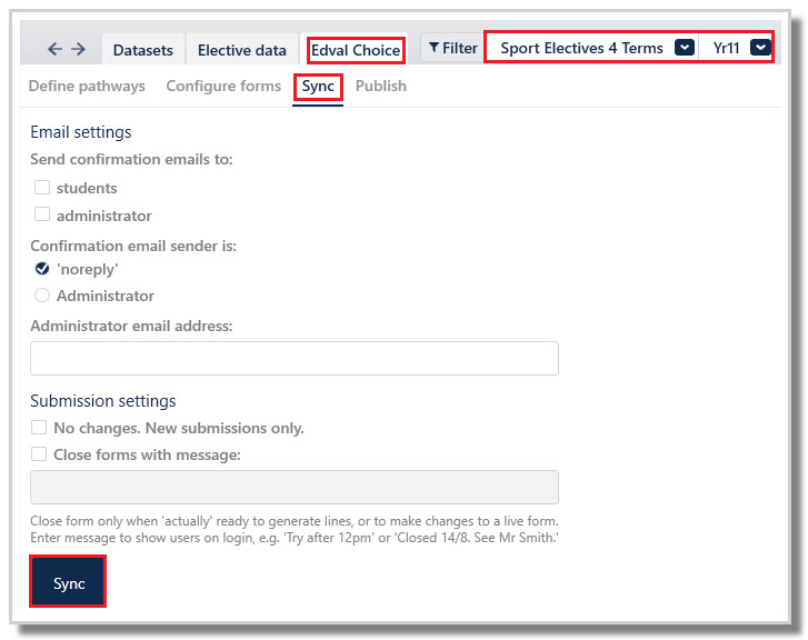 - Once the submission period ends, the forms can be closed in Lines > Edval Choice > Sync.