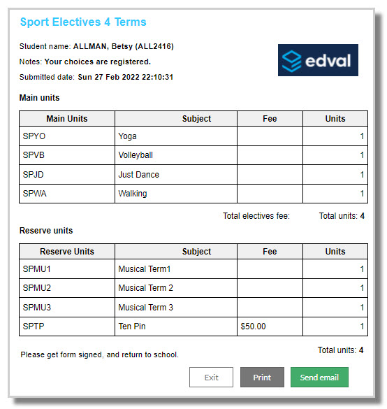 - Students log in to my.edval.education with their WebCodes to select their sport choices and submit the form. They may email or print a copy of their submission.