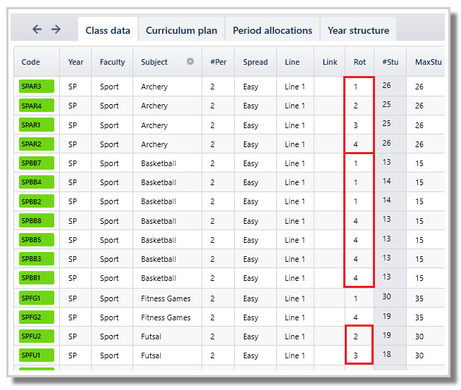 This will transfer the sport classes into the Classes > Class Data (F6) screen in the SP year level, populate the class lists, the #Per (number of periods) and the Rot (rotation) fields.