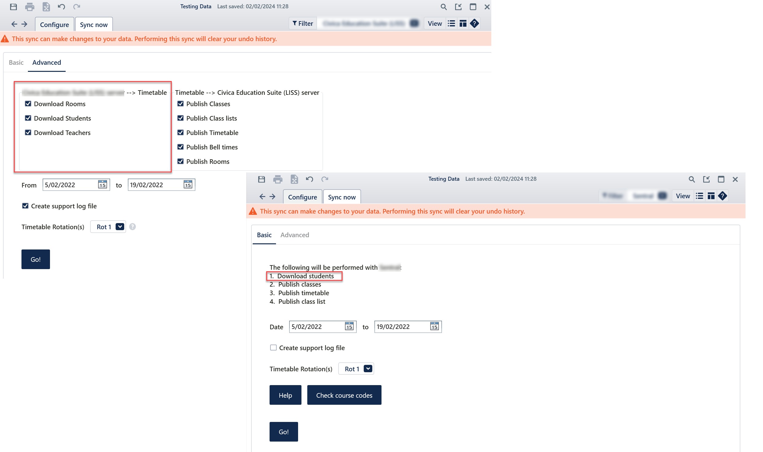 A data check will occur between the two systems when a basic sync is done, or if you choose to download data from other system into the Timetable in the Advanced sync.