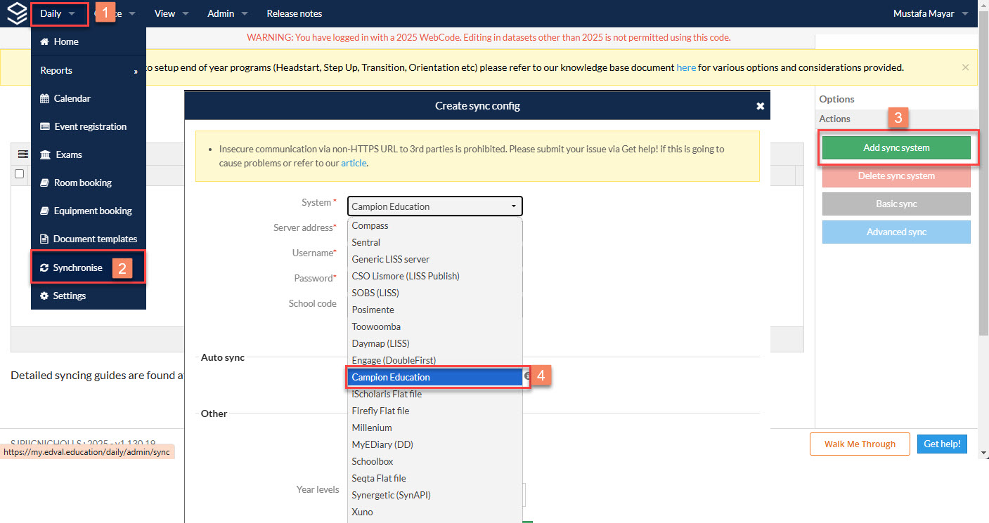 Data for the selected years only will be synced to the configured Campion Education server address.