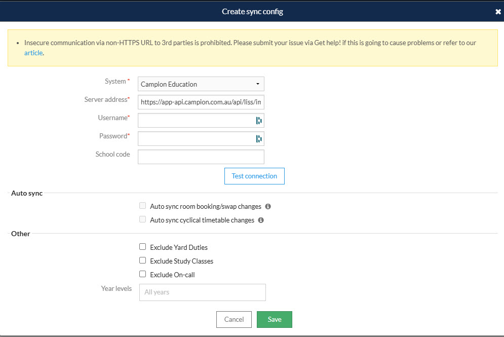 The default format of the server address for Campion Education is https://app-api.campion.com.au/api/liss/import This is an editable field and can be edited to a different URL and saved if need be.