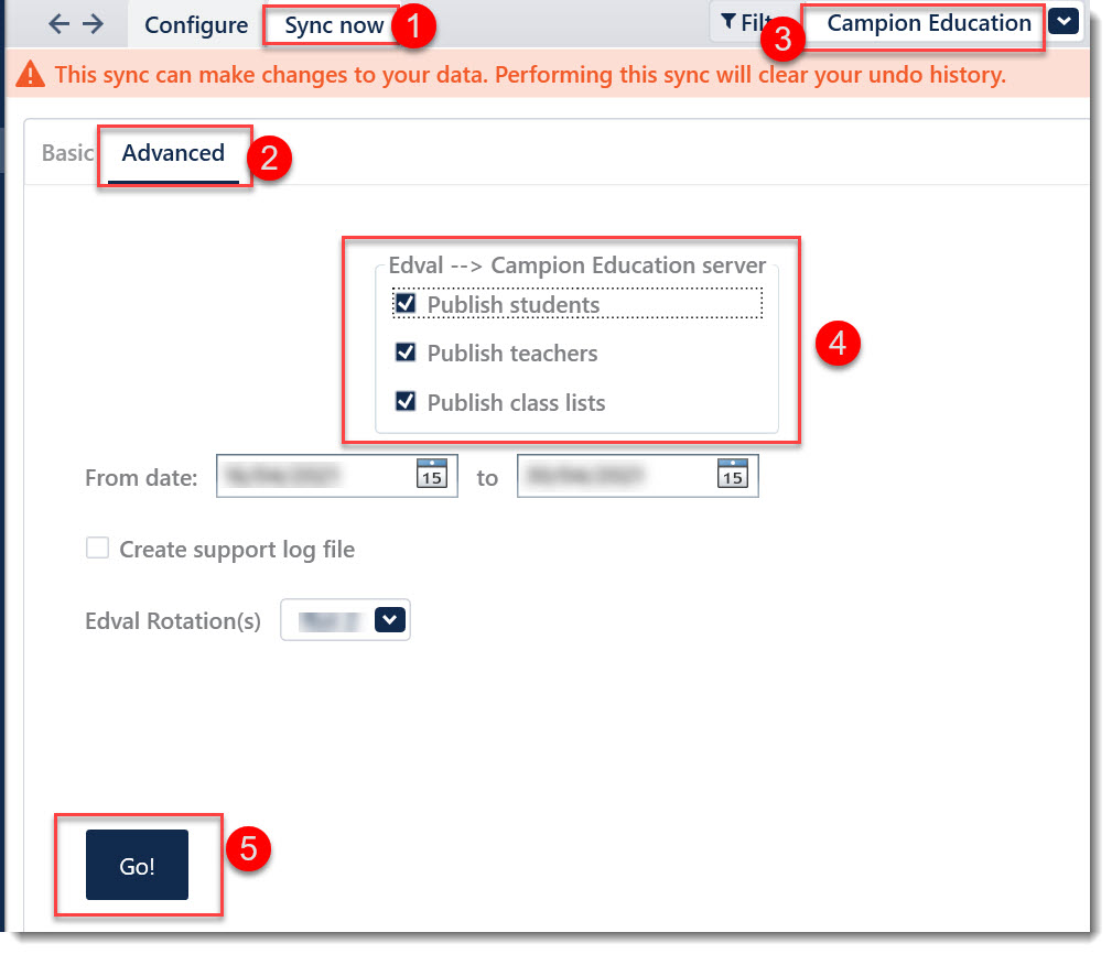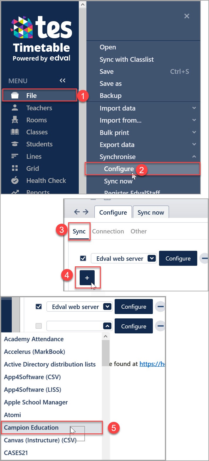 In Tes timetable file, go to 'File > Synchronise > Sync now' - Make sure 'Campion Education' is in the 'Filter' drop-down on the top right.