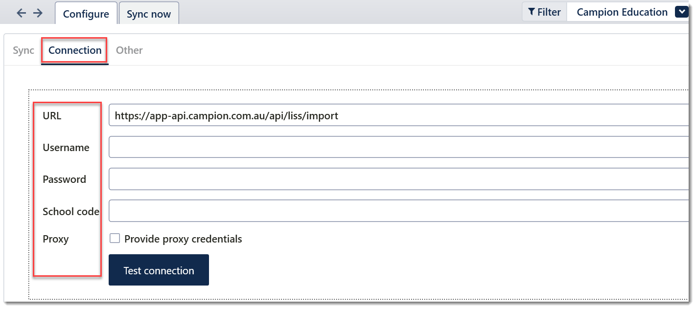Once these details have been entered, click the 'Test Connection' button to check that the details are correct and the link between Tes and Campion is working correctly.