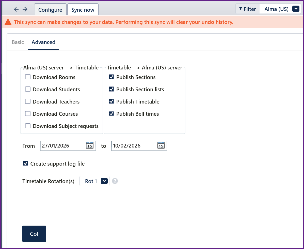 Input the date range you wish to update the Alma in and select the rotation you wish to sync