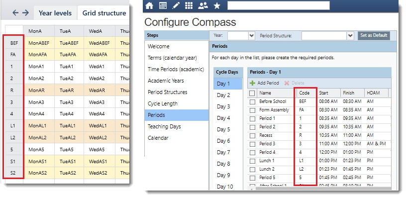 - Period codes in Timetable's grid structure ( File > Setup > Grid Structure ) must exactly match the codes of the period structure in Compass.