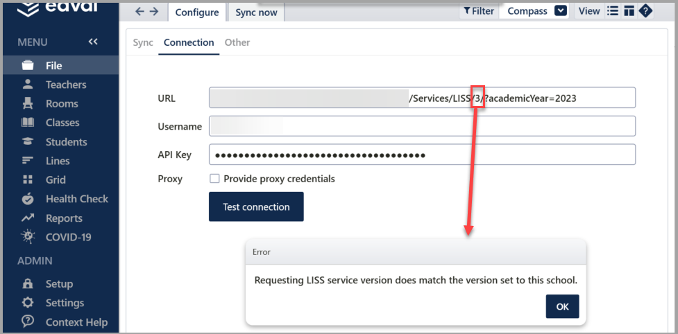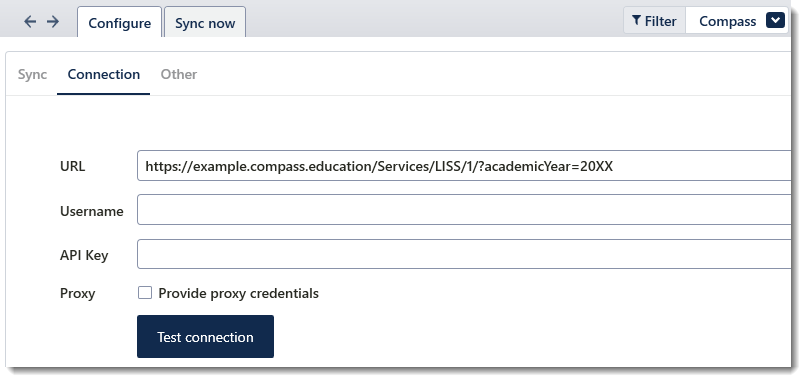 URL | Compass will provide the URL, however you will need to adjust the academic year at the end to the correct year for you. This is matching against the import identifier in Compass for each academic year. Headstart periods will use a different import ID such as 20XXHS. If you receive an error stating that the 'LISS service version does not match', then you will need to change the number in the URL following '/LISS/' from '1' to '3' or vice versa. |