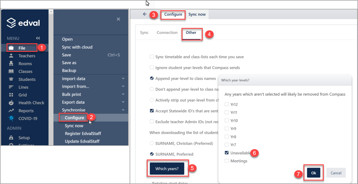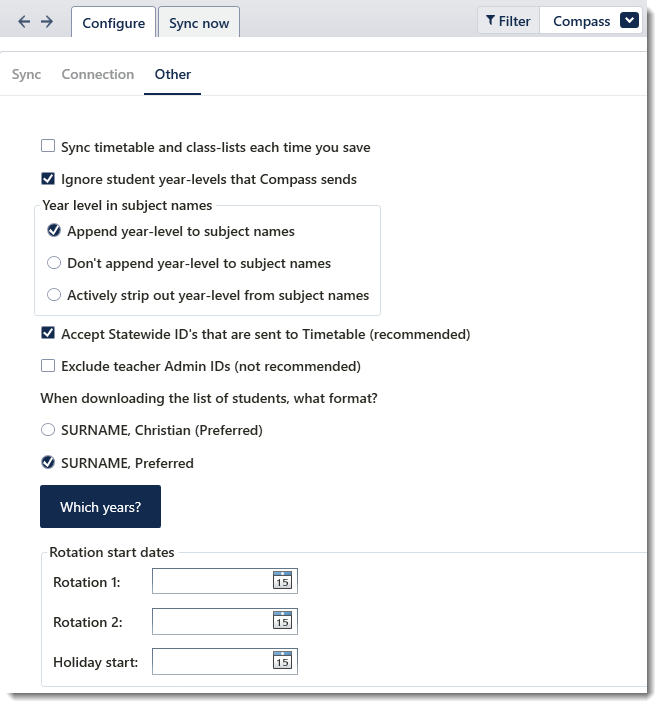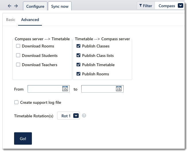 Rotation classes | Classes from particular rotations | No | Compass will receive all exportable classes in the timetable, however the timetable data for those classes can be sent per rotation. The rotation for syncing will default to the current rotation set in the file under Settings > File, but you can override this when doing an advanced sync. |