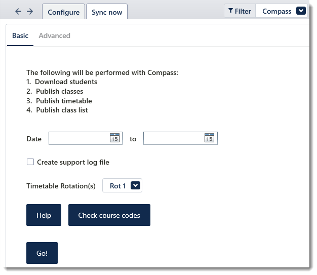 For both sync methods the date will default to being from the current date, to a date 2 weeks ahead. Whenever you move tabs or screens the date will reset so be careful to confirm it is correct before clicking the 'Go!' button to sync. It's recommended to sync for the whole term in preparation for the first day. You can then supplementally sync when changes arise or sync from that date until the end of the term. If you experience any issues syncing and need to lodge a support ticket to progress, please sync again with 'create support log file checked and make sure to attach those files to your ticket.