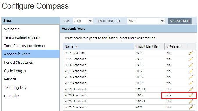 If the academic year is the currently relevant academic year in Compass, the 'Is Relevant' column will show 'Yes', indicating that the checkbox has been ticked when the academic year was originally configured. This information can be changed or updated at any time; please refer to the Compass Knowledge Base for further information.