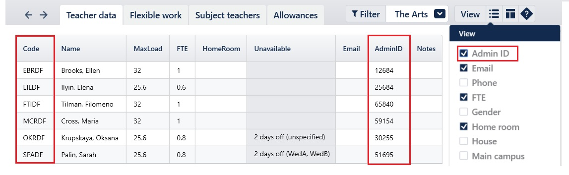 As mentioned previously, codes must match for data to transfer successfully. The Teacher data screen contains more than one column for teacher codes, and therefore there are options as to which code is used for syncing purposes. The two codes that can be used for syncing purposes are the Code field or the AdminID field. Users should check which codes are to be used for syncing purposes.