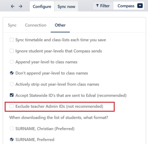 If an AdminID exists in the file, this overrides the Code column for syncing purposes. There is a setting in the Compass sync screen (File > Synchronise > Configure > Sync tab (Select Compass) Configure > Other tab) to exclude using the Admin IDs for syncing purposes. When this option is ticked, the Code will be used for syncing purposes.