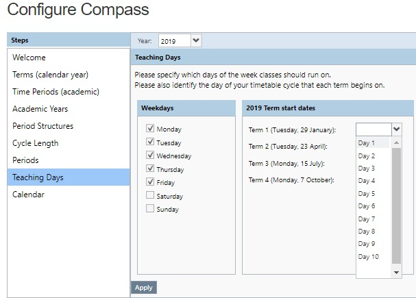 The currently relevant academic year is the academic year which has been configured in Compass as the current information Compass should be displaying in the portal. This includes information such as the current classes assigned to teaching staff, the current enrolments for students and the current financial year.