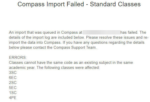 For example with Class 6E.C and 6EC.L3, Compass sees the course code of '6EC' from '6EC.L3' and adds it to the 'Subjects' import job - it then tries to add the class '6EC' from '6E.C' into 'Standard Classes' import job and can't as it sees that there is already a subject called '6EC' in the 'Subjects' import job .