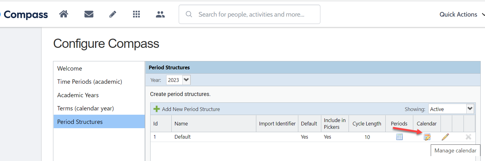 Navigate to the Tools menu (cog icon) > Administration Tools > Configure Schedules , then click on the 'Academic Years' link in the left-hand column to see a list of the academic years recorded in Compass.