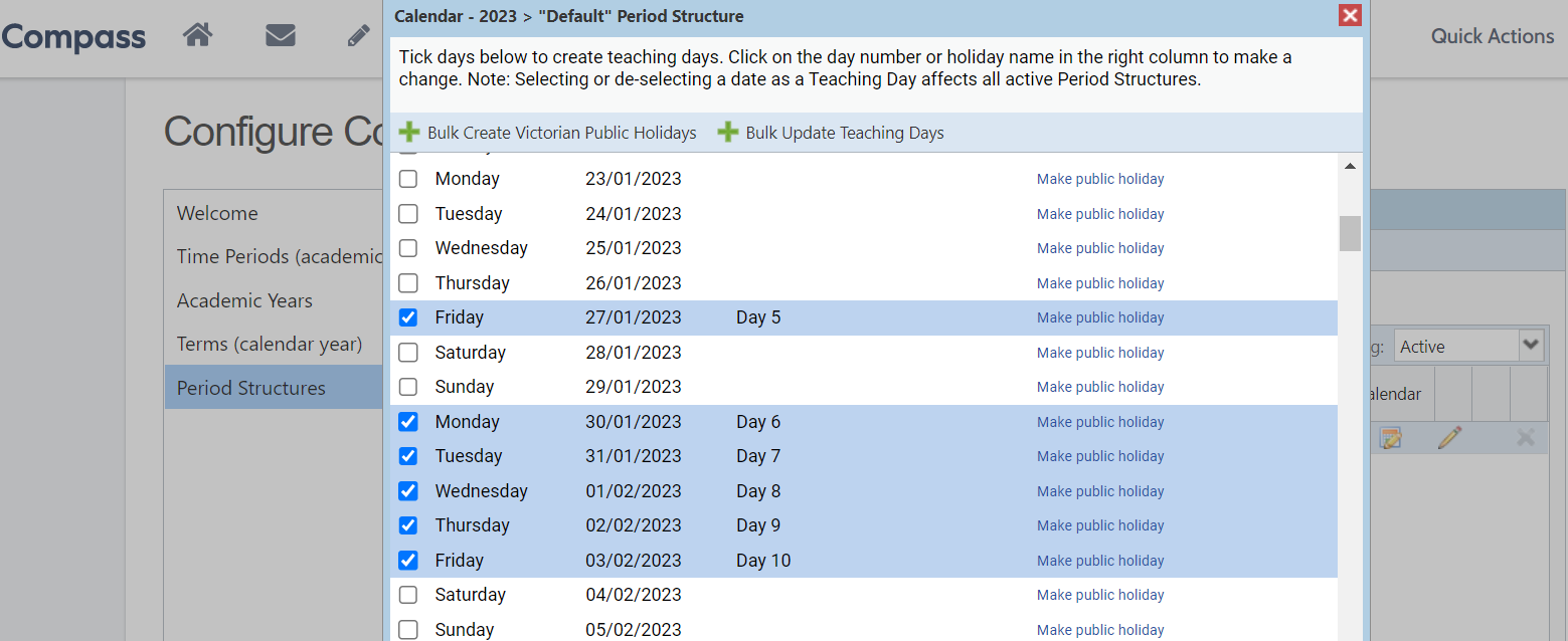 Duty roster | Yes | As duties commonly run in non-teaching periods you must also add these periods to your period structures in Compass for them to appear correctly. | |