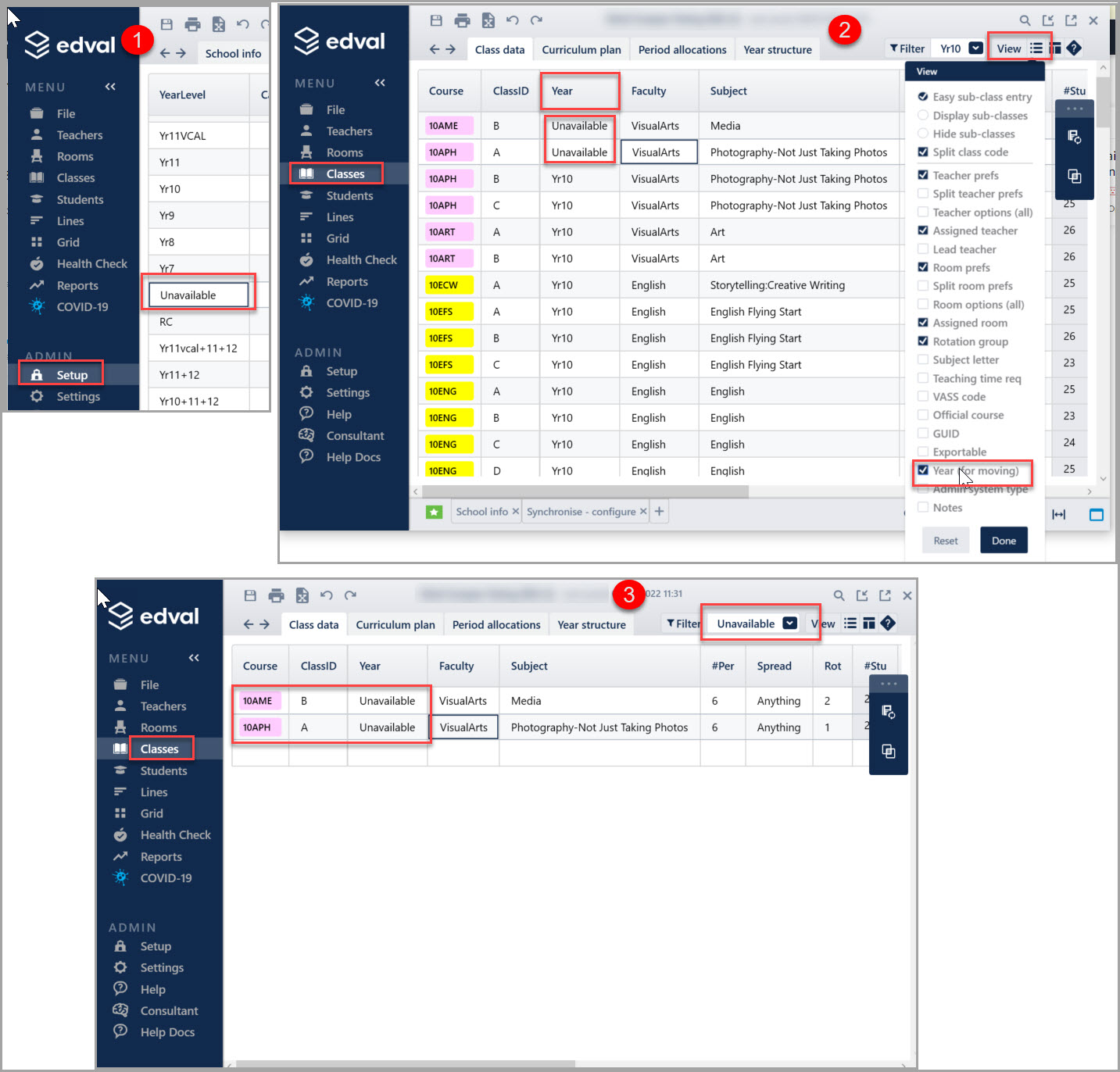 - You can create a new year level and move those classes to that particular year. After the new year level is created in setup->year levels then go to classes->class data-> u se the View menu (top-right) to tick the 'Year (for moving)' option. The year column will now appear next to the "Class ID" column, so in the original year level you can type in the new one in the 'Year' column.