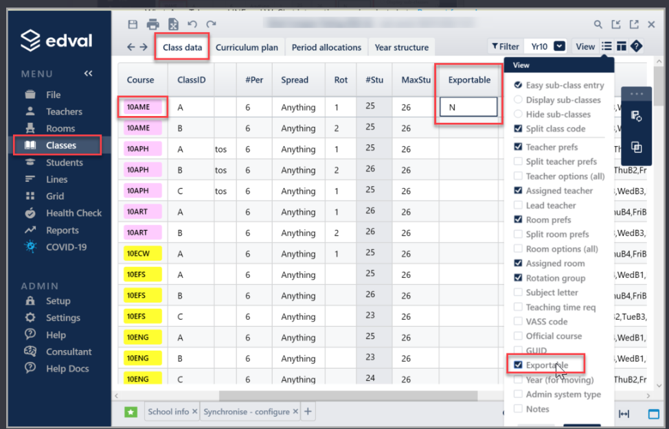 - If you instead wanted specific classes to be excluded from all syncs then you would use the "Exportable" column in Class data. If the exportable column is not already visible, use the View menu in the top right to tick the 'exportable' option. As per the screenshot below, you will need to enter an 'n' to mark classes and non-exportable. Blank cells will be considered as having a 'y' in place by default and so will be exportable.