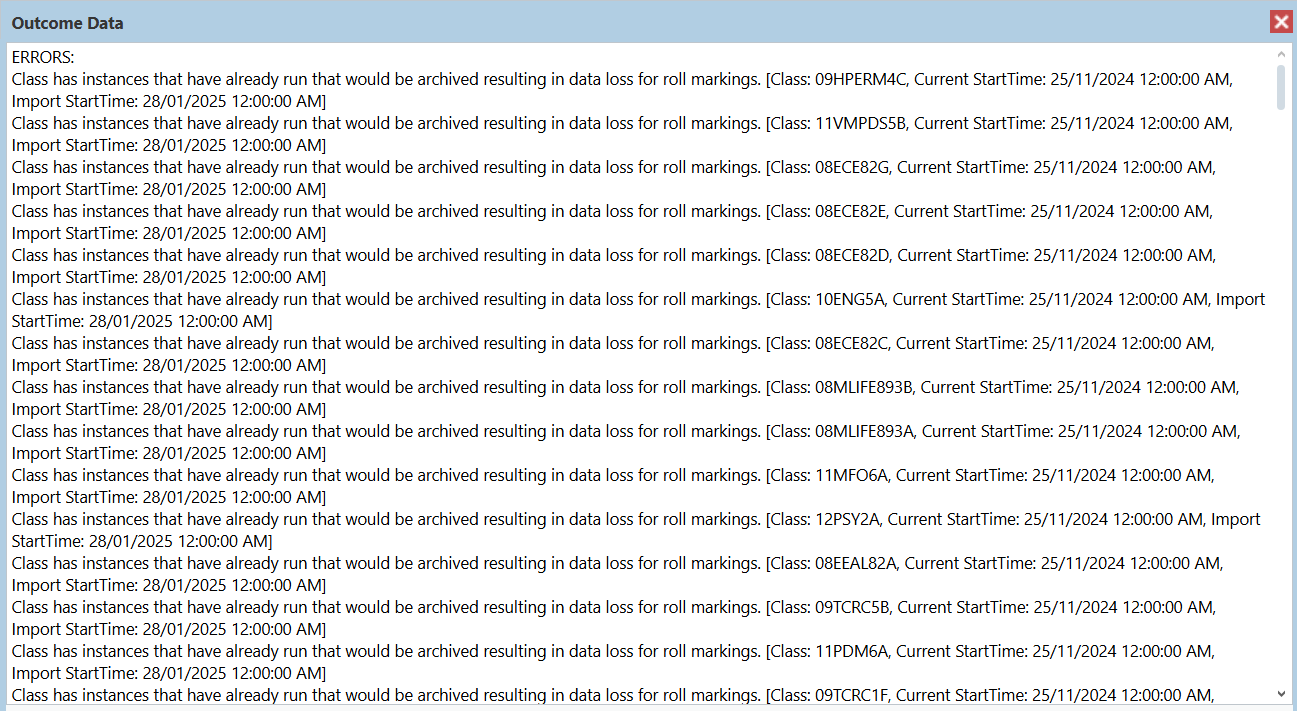 22. Classes are not syncing and receiving the error 'Class has instances that have already run that would be archived resulting in data loss for roll markings.'