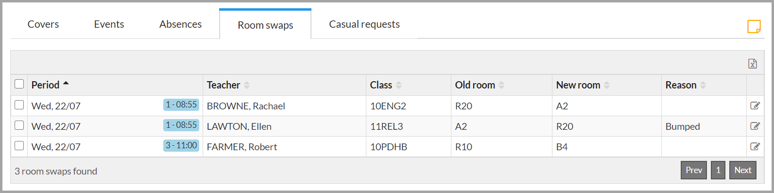 The ‘Room swaps’ tab allows you to enter temporary room changes. These override any room bookings and will automatically bump existing classes out of their rooms if necessary. For bulk room changes, it is advised to use an event.