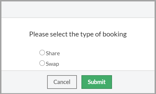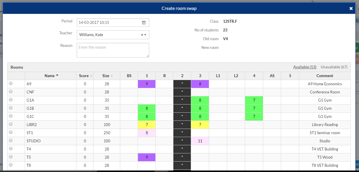 5. If the required room is unavailable, it will appear in the 'Unavailable' tab. When an unavailable room is selected there will be two options presented: Share or Swap.  When 'Share' is selected, a room clash will be created and both classes will share the selected room.  When 'Swap' is selected, a swap will occur, with the class originally in the selected room 'bumped' into the room vacated by the other class.