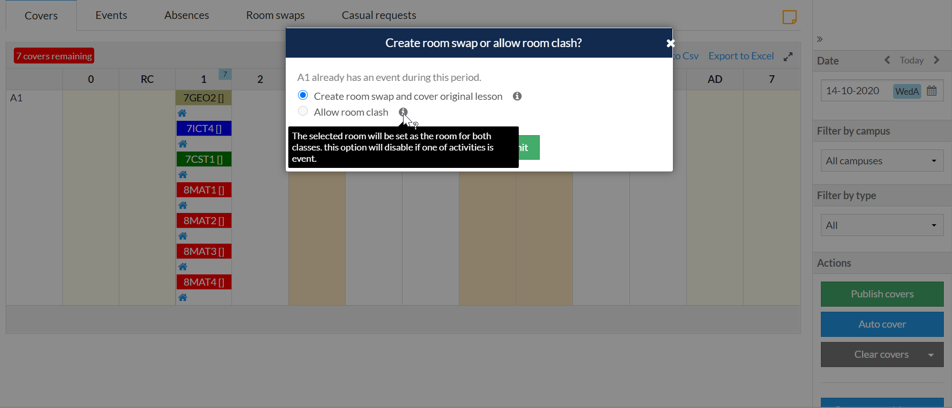 If the room swap is for an event then a room clash will not be allowed. That option will be disabled and will appear greyed out. Please see the tooltip as shown below: