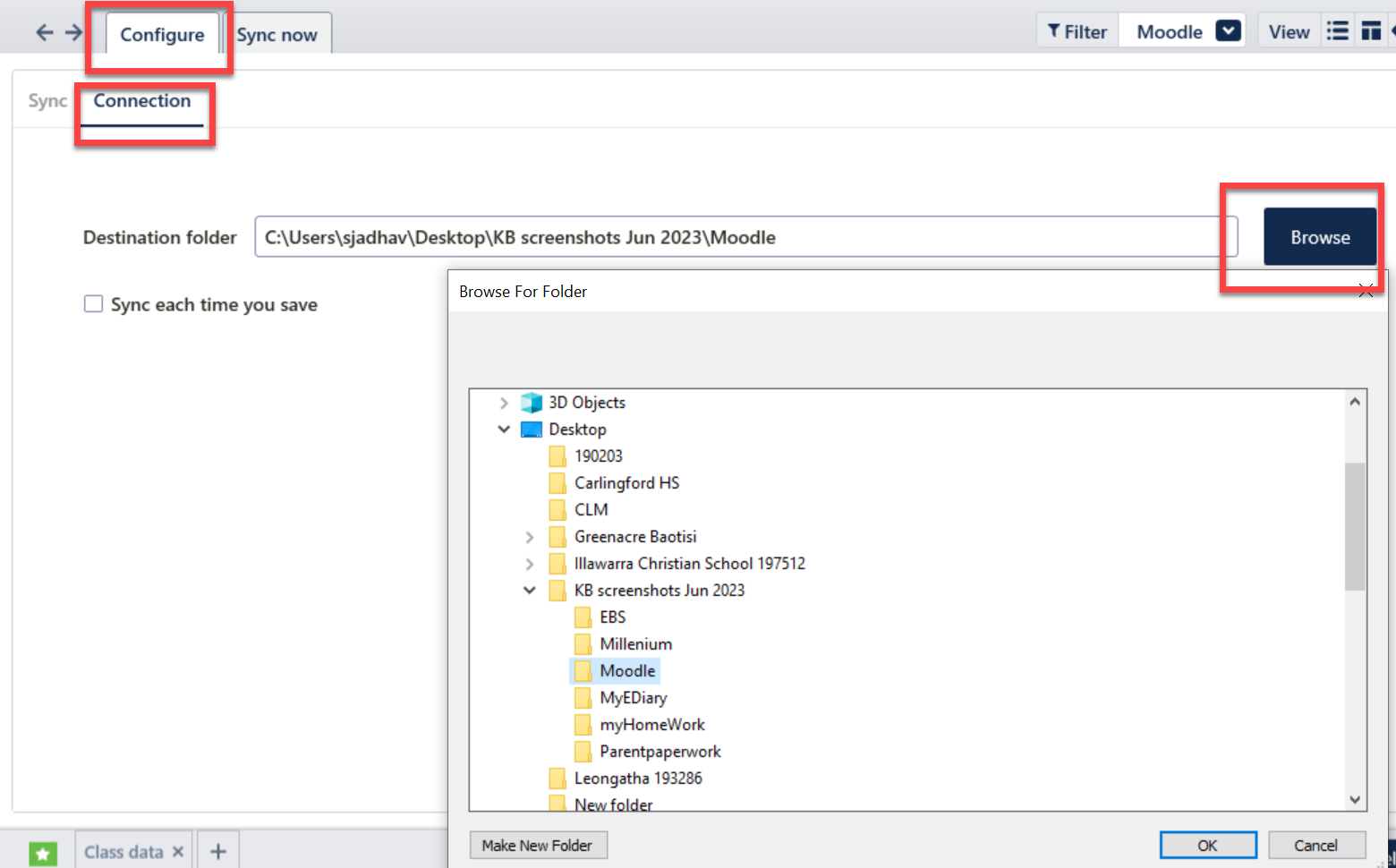 - On the Connection Tab click ‘Browse’ to configure a destination folder (This is where the CSV file is saved)