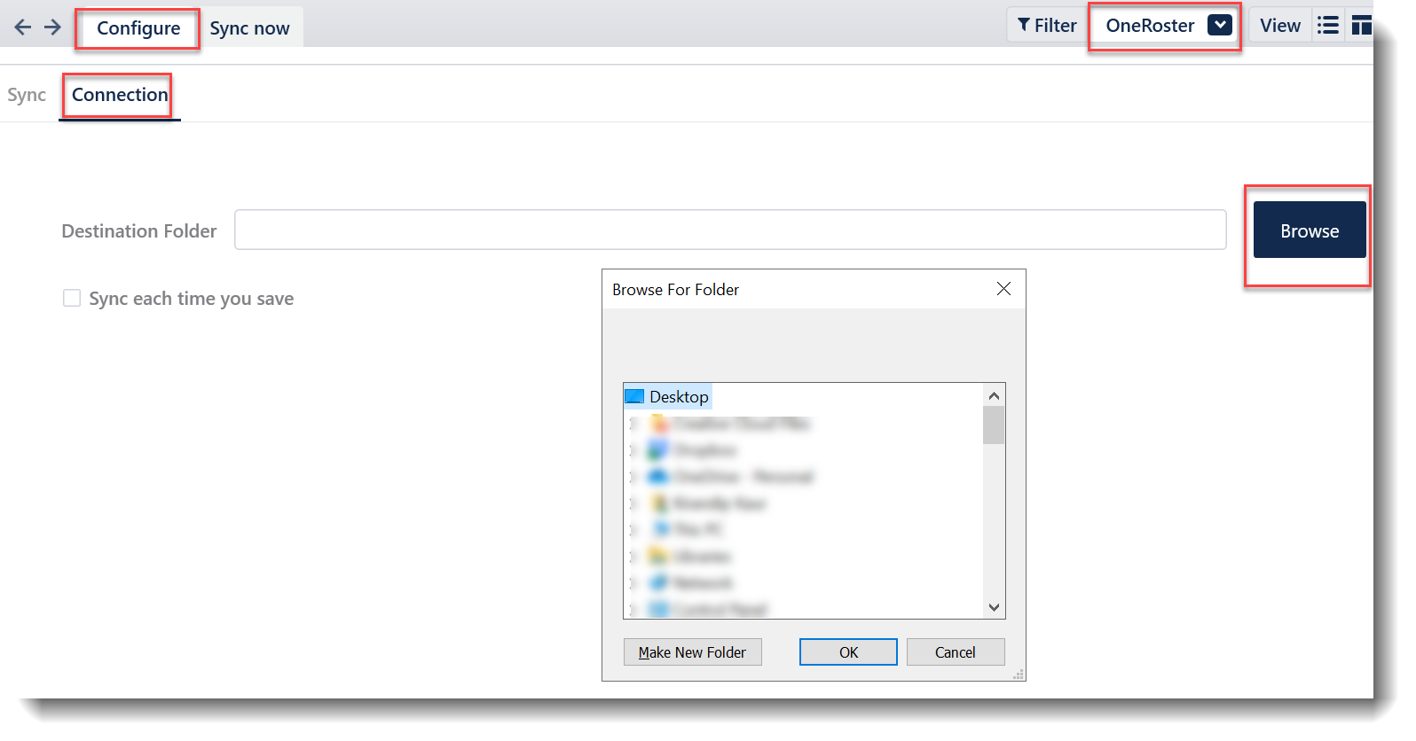 - Select the Configure button, which will move you to the Connection tab. A destination folder must be selected to direct where the .csv files will be saved to. Select Browse and locate or create the desired location.