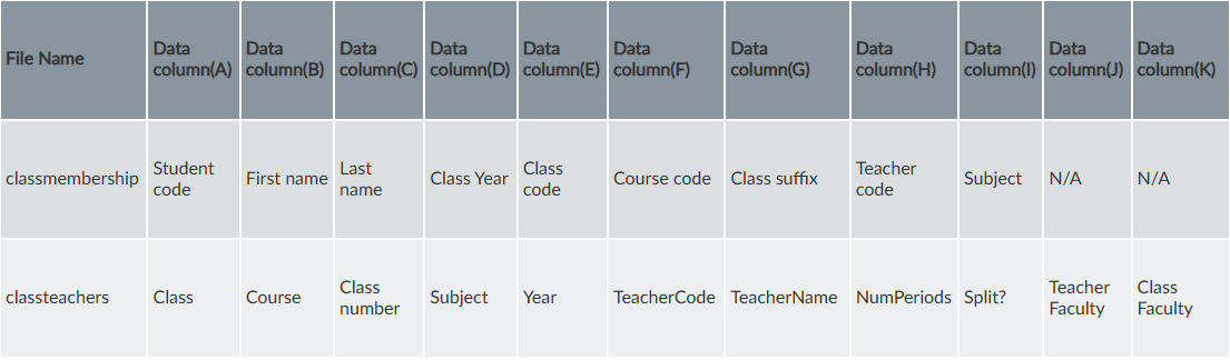 | Classes | Class Code, Subject name | Yes | Classes without teachers assigned will not appear |