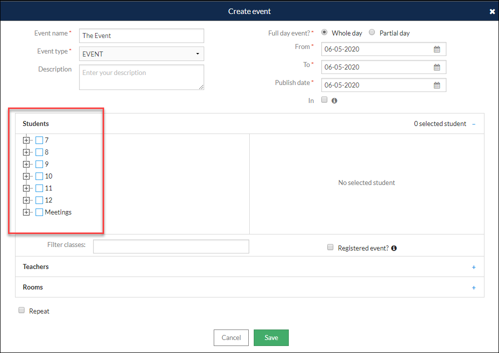 When creating an event, the students who will be attending the event can be selected in a variety of ways.