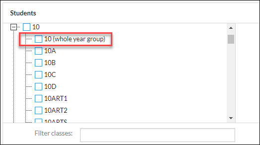 Expanding a Year level will reveal additional selections. 'Whole year group' should be selected when every student from that year level will be attending the event, or when all classes in that year level need to be cancelled. This is very important for both Cancellation and Meadowbank events when composite classes exist.