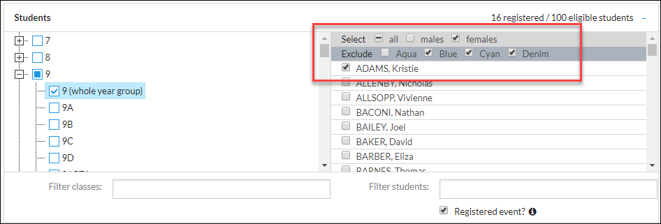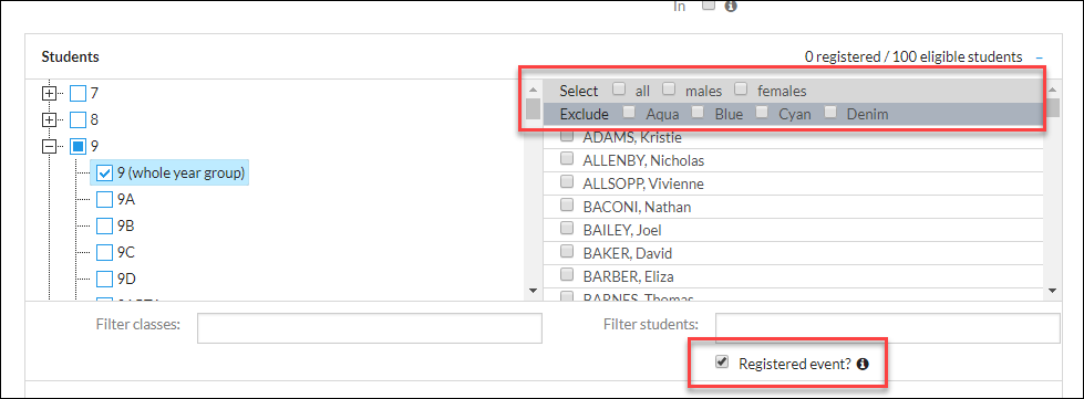 To select students for an event by gender or by house, a registered event needs to be created.  Firstly, select the 'whole year group' tick box from the selection tree on the left to display all students in that year level, then select 'Registered event' below the list of students. This will enable the gender and house options, which will appear above the list of students.